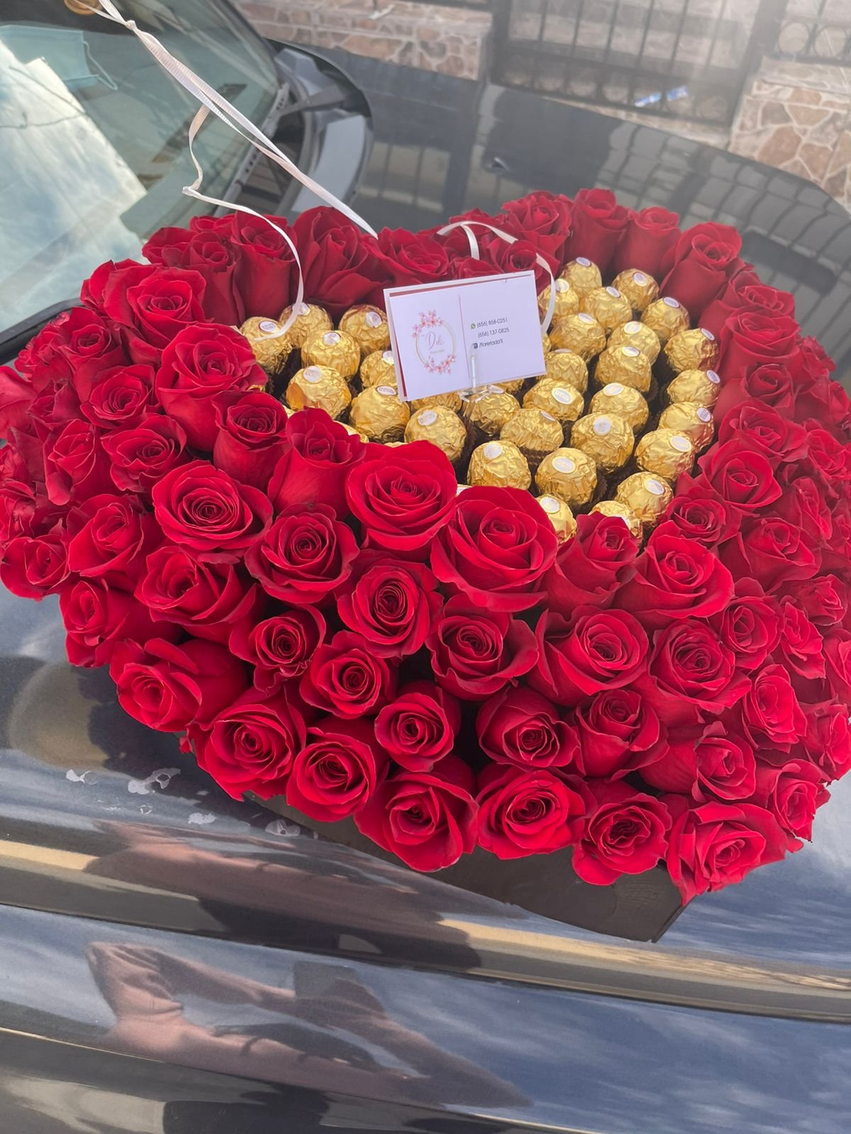 Este impresionante arreglo de 120 rosas es la combinación perfecta de elegancia y dulzura. Acompañado de deliciosos chocolates Ferrero Rocher, está diseñado para transmitir emociones únicas y brindar alegría a la persona especial en tu vida. La base de madera de 20 pulgadas no solo realza su belleza, sino que también garantiza un toque natural y sofisticado.